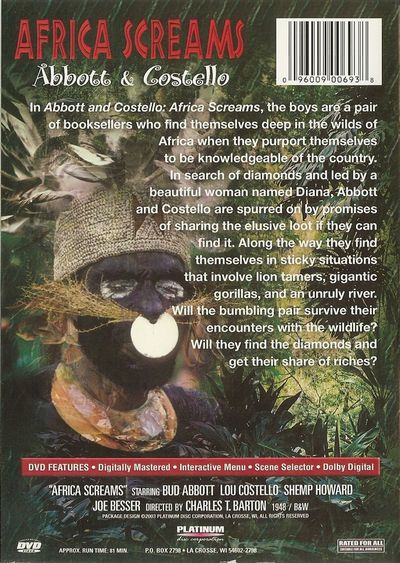In Abbot and Costello: Africa Screams, the boys are a pair of booksellers who find themselves deep in the wilds of Africa when they purport themselves to be knowledgeable of the country. In search of diamonds and led by a beautiful woman named Diana, Abbott and Costello are spurred on by promises of sharing the elusive loot if they can find it. Along the way they find themselves in sticky situations that involve lion tamers, gigantic gorillas, and an unruly river. Wil the bumbling pair survive their encounters with the wildlife? Will they find the diamonds and get their share of riches?
