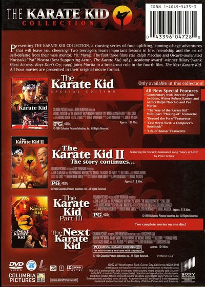 Presenting The Karate Kid Collection, a rousing series of four uplifting, coming of age adventures that will leave you cheering! Two teenagers learn important lessons in life, friendship and the art of self-defense from their wise mentor, Mr. Miyagi. The first three films star Ralph Macchio and Oscar nominated Noriyuki "Pat" Morita (Best Supporting Actor, The Karate Kid, 1984), Academy Award winner Hilary Swank (Best Actress, Boys Don't Cry, 1999) joins Morita in a break out role in the fourth film, The Next Karate Kid. All four movies are presented in their original movie format. |
