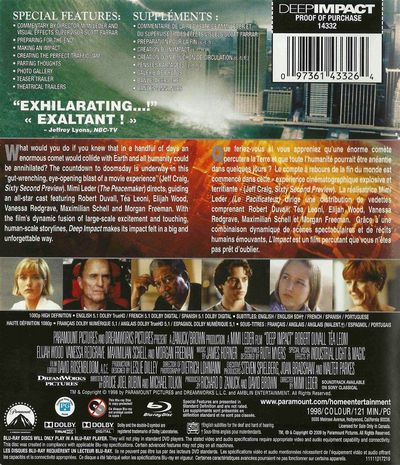 What would you do if you knew that in a handful of days an enormous comet would colide with Earth and all humanity could be annihilated? The countdown to doomsday is underway in this "gut wrenching, eye opening blast of a movie experience" (Jeff Craig, Sixty Second Preview). Mimi Leder (The Peacemaker) directs; guiding an all-start cast featuring Robert Duvail, Tea Leoni, Elijah Wood, Vanessa Redgrave, Maimilian Schell and Morgan Freeman. With the film's dynamic fusion of large-scale excitment and touching human-scale storieslines, Deep Impact makes its impact felt in a big and unforgettable way. |
