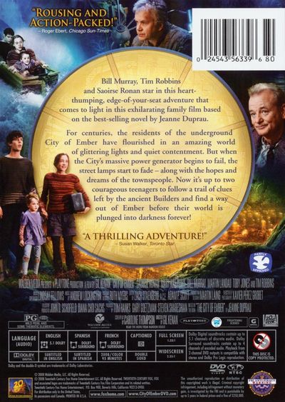 Bill Murray, Tim Robbins and Saoirse Ronan star in this heart-thumping, edge-of-your-seat adventure that comes to light in this exhilarating family film based on the best-selling novel by Jeanne Duprau.For centuries, the residents of the underground City of Ember have flourished in an amazing world of glittering lights and quiet contentment. But when the City's massive power generator begins to fail, the street lamps start to fade - along with the hopes and dreams of the townspeople. Now it's up to two courageous teenagers to follow a trail of clues left by the ancient Builders and find a way out of Ember before their world is plunged into darkness forever!