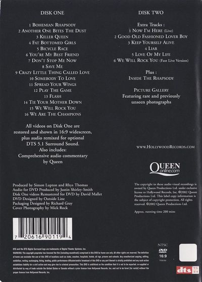 Completely Restored and Remixed in 5.1 Surround Sound 2-DVD SetDolby Digital 5.1 - EnglishDTS Surround 5.1 - EnglishText/Photo Galleries:Production PhotosTracks:Disc One:1. Bohemian Rhapsody2. Another One Bites The dust3. Killer Queen4. Fat bottomed Girls5. Bicycle Race6. You're My Best friend7. Don't Stop Me Now8. Save Me9. Crazy Little Thing Called Love10. Somebody To Love11. Spread your Wings12. Play the Game13. Flash14. Tie Your Mother Down15. We Will Rock You16. We Are The ChampionsDisc Two:1. Now I'm Here2. Good Old Fashioned Lover Boy3. Keep Yourself Alive4. Liar5. Love of my Life6. We Will Rock You (Fast Live Version) |