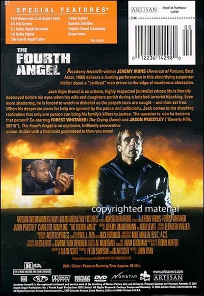 They took everything he had. Revenge isiall that's left.Academy Award-winner Jeremy Irons (Reversal of Fortune, Best Actor, 1990) delivers a riveting performance in this electrifying suspense-thriller about a "civilized" man driven to the edge of murderous obsession. Jack Elgin (Irons) is an urbane, highly respected journalist whose life is literally destroyed before his eyes when his wife and daughters perish during a botched terrorist hijacking. Even more shattering, he is forced to watch in disbelief as the perpetrators are caught-and then set free. When his desperate pleas for help are ignored by the police and politicians, Jack comes to the shocking realization that only one person can bring his family's killers to justice. The question is: can he become that person? Co-starring Forest Whitaker (The Crying Game) and Jason Priestley (Beverly Hills, 90210),The Fourth Angel is an explosive, brilliantly provocative action-thriller with a final twist guaranteed to blow you away! |