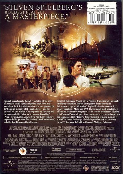 Inspired by real events, Munich reveals the intense story of the secret Israeli squad to track down and assassinate the 11 Palestinians believed to have planned the 1972 Munich massacre of 11 Israeli athletes – and the personal toll this mission of revenge takes on the team and the man who led it. Hailed as “tremendously exciting” (Peter Travers, Rolling Stone), Steven Spielberg’s explosive suspense thriller garnered five Academy Award nominations, including Best Picture and Best Director.Inspiré de faits vécus, Munich révèle l’histoire dramatique de l’escouade israélienne clandestine chargée de traquer et d’assassiner les 11 Palestiniens auxquels était attribuée la planification du massacre de 11 athlètes israéliens à Munich en 1972. Il expose également les retombées néfastes de cette mission vengeresse sur les vies des membres de l’équipe et de l’homme l’ayant dirigée. Salué comme une œuvre “aussi captivante que palpitante” (Peter Travers, Rolling Stones), le suspense poignant et explosif de Steven Spielberg a récolté cinq nominations aux Academy Award, dont ceux du Meilleur Film et du Meilleur Réalisateur.