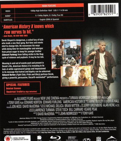 Derek Vinyardis dangerous, a coiled fury of hate who leads a neo-Nazi gang. But time and events start to change him. He reassesses his ways while doing time for manslaughter and emerges from prison eager to keep his younger brother (Edward Furlong) from falling victim to the thug cycle of violence and payback. It may be too late.Weaving in and out of events past and present in Derek's life, American History X is revealing in its look at white-supremacist gangs and impassioned in its message that hatred and bigotry can be unlearned. Edward Norton (Fight Club. Pride And Glory) portrays Derek, giving a powerful, persuasive, Oscar-nominated performance. |