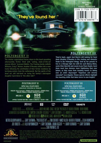 Poltergeist II:The sinister supernatural forces return in this heart-pounding otherworldly thriller filled with "jolting, state-of-the-art special effects" (Leonard Maltin). The Freeling family settles into a new home following the annihilation of their former residence by terrifying visitors from the netherworld. But the spirits of the dead are still hell-bent on luring the family's clairvoyant daughter Carol Anne to "the other side".Poltergeist III:They're back... again! And they're still looking for Carol Anne in this riviting and climactic finale to the Poltergeist trilogy. Sent by her parents to live in a Chicago high rise with her aunt, uncle and cousin, Carol Anne must face demos more frightening than ever before, as they move from invading homes to taking over an entire skyscraper! "Ingenius and cleverly executed" (Los Angeles Times) special effects highlight this haunting chiller that takes terror to new heights!