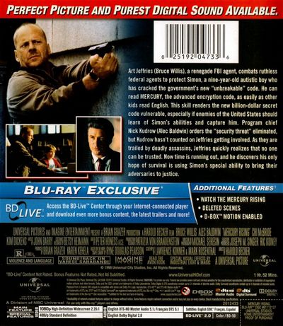 Art Jeffries, a renegade FBI agent, combats ruthless Federal agents to protect Simon, a nine-year-old autistic boy who has cracked the government's new "unbreakable" code. He can read MERCURY, the most advanced encryption code, as easily as other kids read English. This ability renders the new billion-dollar secret code vulnerable, especially if enemies of the United States should learn of Simon's abilities and capture him. Program Chief Nick Kudrow orders the "security threat" eliminated, but Kudrow hasn't counted on Jeffries getting involved. As they are trailed by deadly assassins, Jeffries quickly realizes that no one can be trusted. Now time is running out and he discovers his only hope of survival is using Simon's special ability to bring their adversaries to justice. |