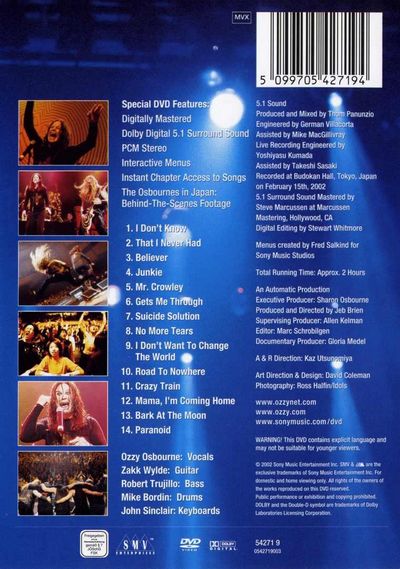 Ozzy has made many great live DVD but I think this the best. This DVD captures the live power that Ozzy has. Many of the songs have been made in 80's and some even in 70's but they sound now as fresh as they sound then. Ozzy seems to enjoy the live concerts very much. Also Zakk Wylde and others are really well present in this concert. The solos and the songs are great. I was quite disappointment on "Live & Loud" but this DVD has a place in my metal heart. Great live concert! Tracklisting:1) I Don't Know 2) That I Never had 3) Believer 4) Junkie 5) Mr. Crowley 6) Gets Me Througfh 7) Suicide Solution 8) No More Tears 9) I Don't Want to Change the World 10 )Road to Nowhere 11) Crazy Train 12) Mama, I'm Coming Home 13) Bark at the Moon 14) Paranoid