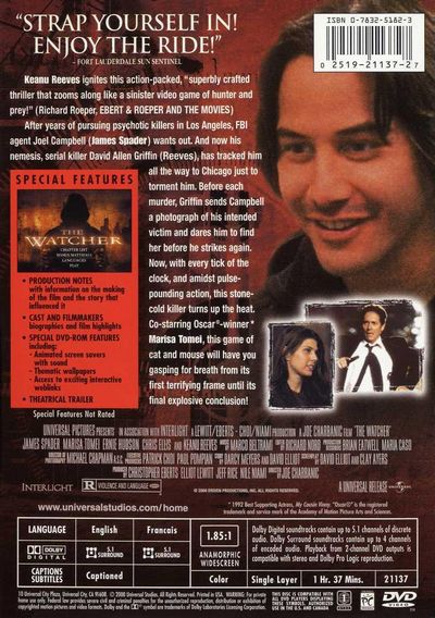 Keanu Reeves ignites this action-packed, "superbly crafted thriller that zooms along like a sinister video game of hunter and prey!" (Richard Roeper, EBERT & ROEPER AND THE MOVIES)After years of pursuing psychotic killers in Los Angeles, FBI agent Joel Campbell (James Spader) wants out. And now his nemesis, serial killer David Allen Griffin (Reeves), has tracked him all the way to Chicago just to torment him. Before each murder, Griffin sends Campbell a photograph of his intended victim and dares him to find her before he strikes again. Now, with every tick of the clock, and amidst pulse-pounding action, this stone-cold killer turns up the heat. Co-starring Oscar®-winner * Marisa Tomei, this game of cat and mouse will have you gasping for breath from its first terrifying frame until its final explosive conclusion!* 1992 Best Supporting Actress, My Cousin Vinny. |