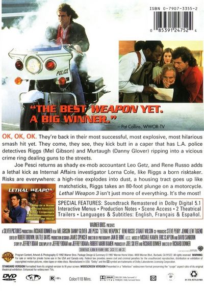 OK, OK, OK. They're back in their most successful, most explosive, most hilarious smash hit yet. They come, they see, they kick butt in a caper that has LA police detectives Riggs (Mel Gibson) and Murtaugh (Danny Glover) ripping into a vicious crime ring dealing guns to the streets. Joe Pesci returns as shady ex-mob accountant Leo Getz, and Rene Russo adds a lethal kick as Internal Affairs investigator Lorna Cole, like Riggs a born risktaker. Risks are everywhere: a high-rise explodes into dust, a housing tract goes up like matchsticks, Riggs takes an 80-foot plunge on a motorcycle. Lethal Weapon 3 isn't just more of everything. It's the most! |