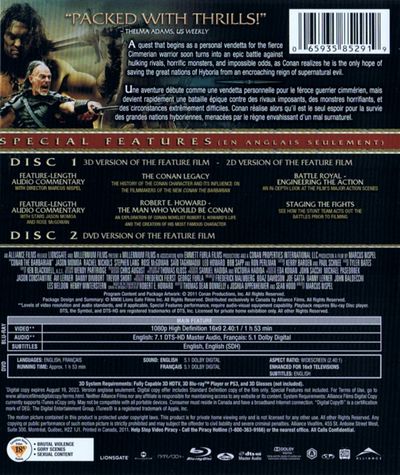 Audio Commentary with Director Marcus Nispel: Prevailing silence and long pauses render Nispel's commentary far less engaging than it might otherwise have been. He certainly has a handle on everything he hoped to accomplish with Conan, but I couldn't shake the feeling that he wasn't entirely pleased with how it all came out. He stops short of apologizing, and has wonderful things to say about his cast and crew. He just doesn't seem as passionate about the film as he does when it comes to Robert E. Howard's swordsman and stories.Audio Commentary with Actors Jason Momoa and Rose McGowan: Momoa and McGowan, on the other hand, keep things lively from start to finish, and made me laugh out loud on more than one occasion. Their commentary chemistry made me wish they shared more scenes on screen, and their conversation is easily the most entertaining thing on the disc.The Conan Legacy (HD, 18 minutes): Nispel and key members of his crew discuss Howard's Conan, his evolution over the decades, and the responsibility the filmmakers felt in bringing the Hyborian barbarian back to the big screen for 21st century audiences.Robert E. Howard: The Man Who Would Be Conan (HD, 11 minutes): An all-too-short look at the life and career of Conan's creator. A more extensive documentary would have been ideal, but its better than nothing.Battle Royal: Engineering the Action (HD, 10 minutes): Chases, clashes, throwdowns, monster attacks and underground battles, courtesy of Nispel and his team.Staging the Fights (HD, 6 minutes): A series of pre-visualizations and rehearsal footage round out the featurettes.Theatrical Trailer (HD, 2 minutes) |