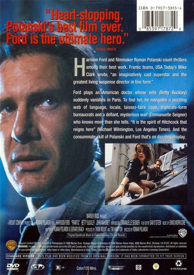 "Harrison Ford and filmmaker Roman Polanski count thrillers among their best work. Frantic teams, USA Today's Mike Clark wrote, ""an imaginatively cast superstar and the greatest living suspense director in fine form.""Ford plays an American doctor whose wife (Betty Buckley) suddenly vanishes in Paris. To find her, he navigates a puzzling web of language, locale, laissez-faire cops, triplicate-form bureaucrats and a defiant, mysterious waif (Emmanuelle Seigner) who knows more than she tells. ""It is the spirit of Hitchcock that reigns here"" (Michael Wilmington, Los Angeles Times). And the consummate skill of Polanski and Ford that's on dazzling display." |