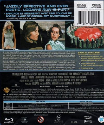 In the Year of the City 2274, humans live in a vast, bubbled metropolis, where computerized servo-mechanisms provide all needs so everyone can pursue endless hedonism. Endless, that is, until Lastday, when anyone who's 30 must submit to Carousel, a soaring, spinning trip to eternity and supposed rebirth. The screen's first use of laser holography highlights this post-apocalyptic winner of a Special Achievement Academy AwardÒ for Visual Effects. Michael York plays Logan 5, a Sandman authorized to terminate Runners fleeing Carousel. Logan is almost 30. Catch him if you can. |