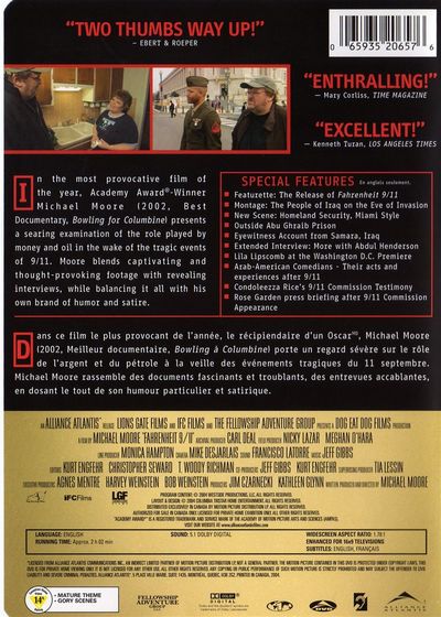 Directed by Michael Moore, whose aura of controversy only grew after his Oscar acceptance speech at the 2003 Academy Awards, Fahrenheit 9/11, like Moore's Bowling For Columbine and Roger & Me, promises to expose the corporate wrongdoings and big-money scandals perpetrated by America's financial elite. This movie, however, looks beyond the inner echelons of General Motors and Lockheed Martin in hopes of outing the evildoers in the White House, particularly in regards to the 43rd President of the United States, George W. Bush. In addition to criticizing the administration's handling of the September 11, 2001, terrorist attacks on the Pentagon and World Trade Center, Moore digs deep into the surprising relationship with the Bin Laden family held by both Bush administrations, and questions whether or not potential Saudi involvement with the attacks has been ignored. As Fahrenheit 9/11's Cannes Film Festival debut approached, marking only the second time in 48 years that a documentary has been included among the festival's main competition, Miramax's parent company Disney announced it would not be distributing the film due to its partisan nature, and, according to Moore, out of trepidation that the Florida-based Goliath's multi-million-dollar tax breaks might be negatively affected by Florida Governor Jeb Bush, whose review within Fahrenheit 9/11 is less than favorable. |