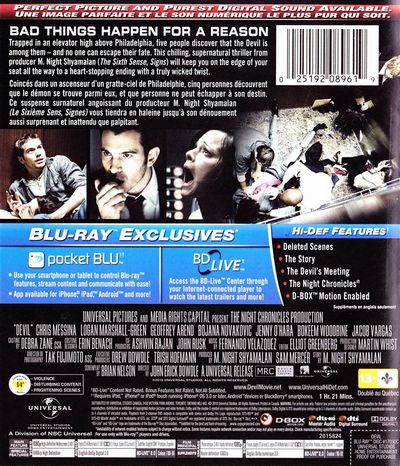 "Trapped in an elevator high above Philadelphia, five people discover that the Devil is among them - and no one can escape their fate. This chilling, supernatural thriller from M. Night Shyamalan ('The Sixth Sense,' 'Signs') will keep you on the edge of your seat all the way to a heart-stopping ending with a truly wicked twist." |