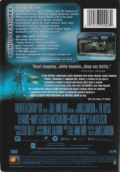 "Heart stopping...white knuckle...deep sea thrills." -David Ansen, NewsweekIn this thrilling, underwater action adventure from writer-director James Cameraon (Titanic, Terminator2: Judgement Day, Aliens), a civilian oil rig crew is recruited to conduct a search-and-rescue effort when a nuclear submarine mysteriously sinks. One diver (ED HARRIS) soon finds himself on a spectacular odyssey 25,000 feet below the ocean's surface whre he confronts a mysterious force that has the power to change the world or destroy it.MARY ELIZABETH MASTRANTONIO and MICHAEL BIENN co-star. |