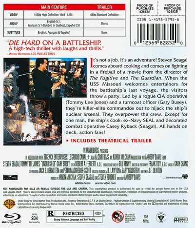 It's not a job. It's an adventure! Steven Seagal comes aboard and comes on strong, combining humor and heroics in a fireball of a movie. The excitement starts when the USS Missouri welcomes aboard musicians and caterers set to provide entertainment during the famed battleship's last voyage. The visitors throw a party, all right. A war party. Led by a rogue CIA operative (JFK's Tommy Lee Jones) and a turncoat officer (Lethal Weapon's Gary Busey), they're really killer-elite commandos out to hijack the ship's nuclear arsenal. They overpower the crew. Except for one man. "I'm just a cook," that man says. But he's a cook with a recipe for action. He's ex-Navy SEAL and highly decorated combat operative Casey Ryback (Seagal). Relying on his slam-bang martial-arts skills and equipped with enough hardware to single-handedly wage World War III, Ryback turns the Missouri's deck and below deck areas into guerilla combat zones. All hands ready, action fans! |