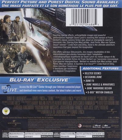 Dazzling special effects, unforgettable images and powerful performances highlight David Lynch’s stunning film version of Frank Herbert’s classic science-fiction epic about an intergalactic warrior’s messianic rise. Starring Kyle MacLachlan, Virgian Madsen, Jose Ferrer, Max Von Sydow, Oscar winner Linda Hunt and Sting, Dune is the ultimate adventure experience that goes beyond the imagination.----------------------------------------------------------Des effets spéciaux éblouissants, des images inoubliables et des interprétations percutantes foisonnent dans l’adaptation cinématographique stupéfiante de David Lynch du roman épique et du classique de science-fiction de Frank Herbert sur l’ascension messianique d’un guerrier intergalactique. Mettant en vedette Kyle MacLachlan, Virginia Madsen, Jose Ferrer, Max Von Sydow, la lauréate d’un Oscar Linda Hunt et Sting, Dune constitue l’expérience d’aventures par excellence qui dépasse l’imagination. |