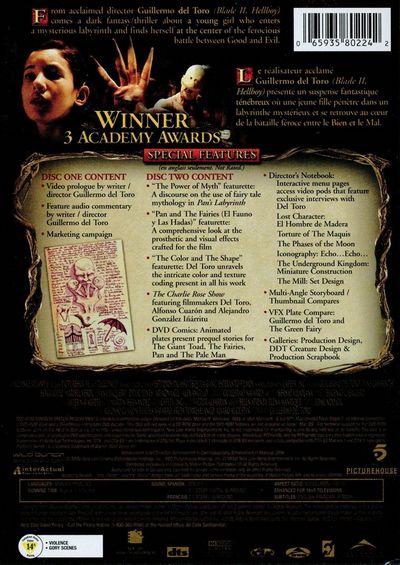 From acclaimed director Guillermo del Toro (Blade II, Hellboy) comes a dark fantasy/thriller about a young girl who enters a mysterious labyrinth and finds herself at the center of the ferocious battle between Good and Evil.Le réalisateur acclamé Guillermo del Toro (Blade II, Hellboy) présente un suspense fantastique ténébreux où une jeune fille pénètre dans un labyrinthe mystérieux et se retrouve au coeur de la bataille féroce entre le Bien et le Mal. |