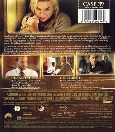 Academy Award winner Renée Zellweger stars in this terrifing supernatural thriller about a social worker who has been assigned the unusual and disturbing case of Lillith Suillivan...a girl with a strange and mysterious past. When Emily (Zellweger) opens her home in an attempt to help Lillith, it turns into a deadly nightmare she may not survive. Co-starring Bradley Cooper (The Hangover), Case 39 is a heart-stopping chiller with startling surprises that lead to a shocking and sinister ending.La lauréate des Academy Award Renee Zellweger tient la vedette de ce suspense surnaturel terrifiant où une travailleuse sociale se voit confier le cas inusité et troublant de Lillith Sullivan... une fillette au passé étrange et mystérieux. Désireuse de venir en aide à Lillith, Emily (Zellweger) décide de l'héberger chez elle; s'ensuivra un cauchemar fatal dont elle ne sortira peut-être pas vivante. Mettant également en vedette Bradley Cooper (Lendemain de Veille), Le Cas 39 est un film d'épouvante à glacer le sang truffé d/étonnants rebondissements qui culminent en une fin bouleversante et sinistre. |