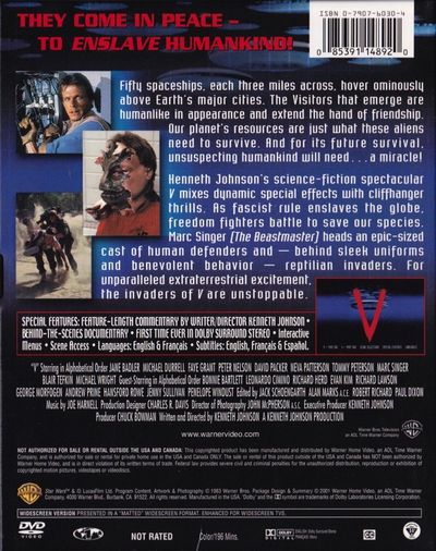 They Come In Peace - To Enslave Humankind!Fifty spaceships, each three miles across, hover ominously above Earth's major cities. The Visitors that emerge are humanlike in appearance and extend the hand of friendship. Our planet's resources are just what these aliens need to survive. And for its future survival, unsuspecting humankind will need… a miracle!Kenneth Johnson's science-fiction spectacular V mixes dynamic special effects with cliffhanger thrills. As fascist rule enslaves the globe, freedom fighters battle to save our species. Marc Singer (The Beastmaster) head an epic-sized cast of human defenders and - behind sleek uniforms and benevolent behavior - reptilian invaders. For unparalleled extraterrestrial excitement, the invaders of V are unstoppable. |
