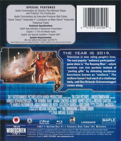 The year is 2019. Television is now ruling peoples lives. The most popular "audience participation" game show is "The Running Man" - where convicts can win pardons instead of "parting gifts" by defeating murderous henchmen known as "stalkers". The stalkers haven't had much of a challenge lately...until Ben Richards (Schwarzenegger) comes along. |