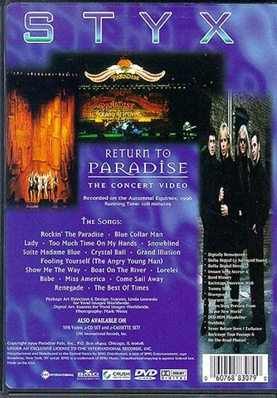 The Concert VideoIncludes The Songs:1. Rocking The Paradise2. Blue Collar Man3. Lady4. Too Much Time On My Hands5. Snowblind6. Suite Madame Blue7. Crystal Ball8. Grand Illusion9. Fooling Yourself10. Show Me The Way11. Boat On The River12. Lorelei13. Babe14. Miss America15. Come Sail Away16. Renegade17. The Best Of Times |