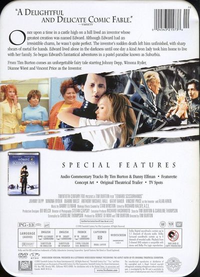 Once upon a time in a castle high on a hill lived an inventor whose greatest creation was named Edward. Although Edward had an irresistible charm, he wasn't quite perfect. The inventor's sudden death left him unfinished, with sharp shears of metal for hands. Edward lived alone in the darkness until one day a kind Avon lady took him home to live with her family. So began Edward's fantastical adventures in a pastel paradise known as Suburbia. From Tim Burton comes an unforgettable fairy tale starring Johnny Depp, Winona Ryder, Dianne Wiest and Vincent Price as the Inventor. |