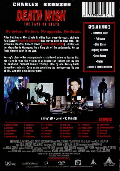 Drifting as far from Michael Winner's original and interesting 1974 Death Wish as possible, this belated sequel in an often ugly series is nevertheless a harmless, fairly conventional thriller featuring a watchable cast. After his life of loss and misery at the hands of criminals, vigilante Paul Kersey is ready to settle down in romantic bliss with a fashion designer named Olivia (Lesley-Anne Down). Unfortunately, the lady happens to be the target of her mobster ex-husband (Michael Parks), who has a tight grip on New York's garment district. Disfigured and finally murdered by her former spouse, Olivia is avenged in very creative ways by Paul, who resorts to such esoterica as using a remote-controlled soccer ball to deliver an explosive punishment. Bronson largely phones it in for this potboiler, though even in the winter of his life he can look quite compelling in his stoic way. Helping to keep things interesting is Parks's kinky cruelty and Saul Rubinek's vaguely bemused performance as a well-meaning prosecutor. |