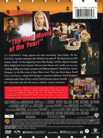L.A. Confidential is "tough, gorgeous and vastly entertaining" (Janet Maslin, 'The New York Times'), "a genuine masterpiece that will knock your socks off" (Rex Reed) and won 1997 Academy Awards for Best Supporting Actress (Kim Basinger) and Best Adapted Screenplay (Brian Helgeland & Curtis Hanson). Director Curtis Hanson and a terrific cast serve up a "ravishing, thrilling tale of police corruption and Hollywood glamour" (Marshall Fine, 'Gannett Newspapers') in this film version of James Ellroy's novel. Three cops (Kevin Spacey, Russell Crowe, Guy Pearce), a call girl (Kim Basinger), a mysterious millionaire (David Strathairn), a tabloid journalist (Danny DeVito), and the Chief of Detectives (James Cromwell) fuel a labyrinthine plot rife with mystery, ambition, romance, and humor. |
