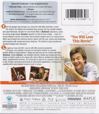 From the people who brought you Juno and Little Miss Sunshine, comes The Switch, the offbeat and heartwarming comedy starring Jennifer Aniston and Jason Bateman. Despite her best friend Wally's (Bateman) objections, smart, fun-loving single Kassie (Aniston) decides it's time to have a baby. -- even if it means taking it into her own hands. But accidents happen and a rip-roaring drunk Wally has to switch her perferred donor's sperm with his own. Quirk and endearing, and complete with unexpected bonus features, The Switch is quite possibly the funniest comedy ever conceived. |