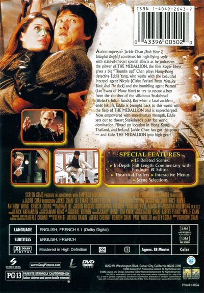 Action superstar Jackie Chan (Rush Hour 2, Shanghai Knights) combines his high-flying style with state-of-the-art special effects as he unleashes the power of THE MEDALLION, the film Roger Ebert gives a big "Thumbs up!" Chan plays Hong Kong detective Eddie Yang, who works with the beautiful Interpol agent Nicole (Claire Forlani from Meet Joe Black and The Rock) and the bumbling agent Watson (Lee Evans of Mouse Hunt) to try to rescue a boy from the clutches of the villainous Snakehead (Warlock's Julian Sands). But when a fatal accident ends his life, Eddie is brought back to this world with the help of THE MEDALLION and is supercharged! Now empowered with superhuman strength, Eddie sets out to thwart Snakehead's plan for world domination. Filmed on location in Hong Kong, Thailand, and Ireland. Jackie Chan has got the power – and kicks THE MEDALLION into high gear! |