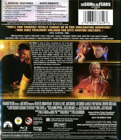 Ben Affleck is ready for action, commanding the role of CIA agent Jack Ryan in this thrilling adventure based on the Tom Clancy bestseller. America's cold war fears are rekindled after the President of Russia dies and is succeeded by a man with a cryptic past. But East-West tensions erupt when the CIA suspects the renegade Russian scientists are developing more nuclear weapons. Mobilized into action by CIA director William Cabot (Morgan Freeman), Jack Ryan follows a danger ridden trail to a shocking conclusion: terrorist plans to provoke a war between US and Russia - by detonation a nuclear bomb at a championship football game! Co-starring James Cromwell and Liev Schreiber, The Sum of all Fears adds up to the year's most explosive entertainment.Ben Affleck saute dans l'action et incarne avec brio l'agent de la CIA Jack Clancy. Les peurs de la guerre froide sont ravivées après la mort du président de la Russie alors que lui succède un homme au passé énigmatique. Les tensions Est-Ouest éclatent et quand la CIA soupçonne de scientifiques russes rebelles de renforcer l'armement nucléaire de leur pays. Lancé dans le feu de l'action Jack Ryan (Affleck) suit une piste parsemée de dangers qui le mêne à une conclusion terrifiante : des terroristes ont l'intention de provoquer une guerre entre les États-Unis et la Russie en faisant exploser une bombe nucléaire au cours d'une partie de championnat de football ! Mettant également en vedette James Cromwell et Liev Schreiber, La Somme de toutes les peurs s'élève au rang de film le plus explosif de l'année. |