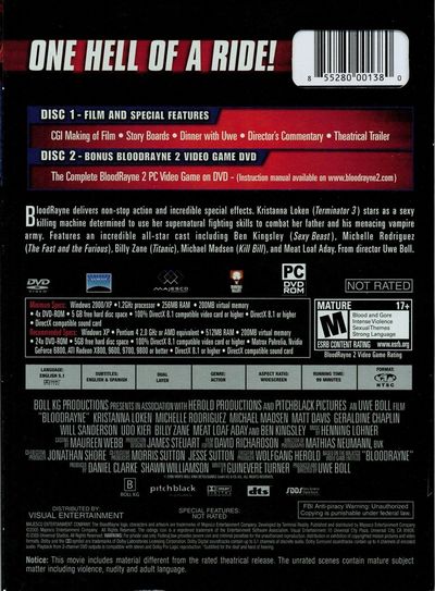 BloodRayne delivers non-stop action and incredible special effects. Kristanna Loken (Terminator 3) stars as a sexy killing machine determined to use her supernatural fighting skills to combat her father and his menacing vampire army. Features an incredible all-star cast including Ben Kingsley (Sexy Beast), Michelle Rodriguez (The Fast and the Furious), Billy Zane (Titanic), Michael Madsen (Kill Bill), and Meat Loaf Aday. From director Uwe Boll. |