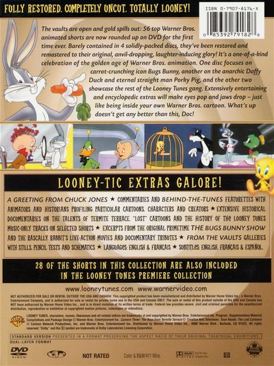 Fully Restored, Completely Uncut, Totally Looney!The vaults are open and gold spills out: 56 top Warner Bros. animated shorts are now rounded up on DVD for the first time ever. Barely contained in a 4 solidly-packed discs, they've been restored and reasserted to their original, anvil dropping, laughter-inducing glory! It's a one-of-a-kind celebration of the golden age of Warner Bros. animation. One disc focuses on carrot crunching icon Bugs Bunny, another on the anarchic Daffy Duck and eternal strait man Porky Pig, and the other Two Showcase the rest of the Loony Tunes Gang. Extensively entertaining and encyclopedic extras will make your eyes pop and your jaws drop- just like being inside your own Warner Bros. cartoon. What's up doesn’t get any better than this, Doc!