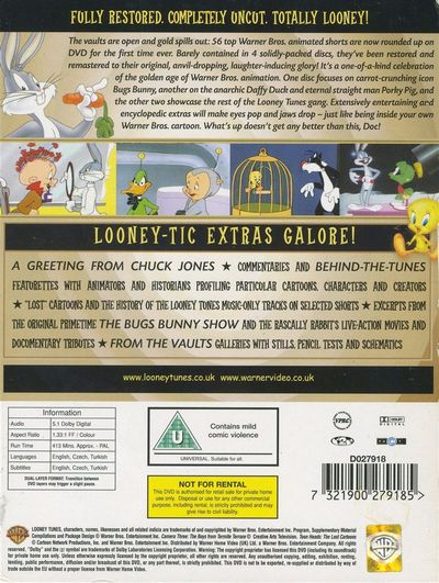 Fully Restored. Completely Uncut. Totally Looney!The vaults are open and gold spills out: 56 top Warner Bros. animated shorts are now rounded up on DVD for the first time ever. Barely contained in 4 solidly-packed discs, they've been restored and remastered to their original, anvil-dropping, laughter-inducing glory! It's a one-of-a-kind celebration of the golden age of Warner Bros. animation. One disc focuses on carrot-crunching icon Bugs Bunny, another on the anarchic Daffy Duck and eternal straight man Porky Pig, and the other two showcase the rest of the Looney Tunes gang. Extensively entertaining and encyclopedic extras will make your eyes pop and jaws drop - just like being inside your own Warner Bros. cartoon. What's up doesn't get any better than this, doc!