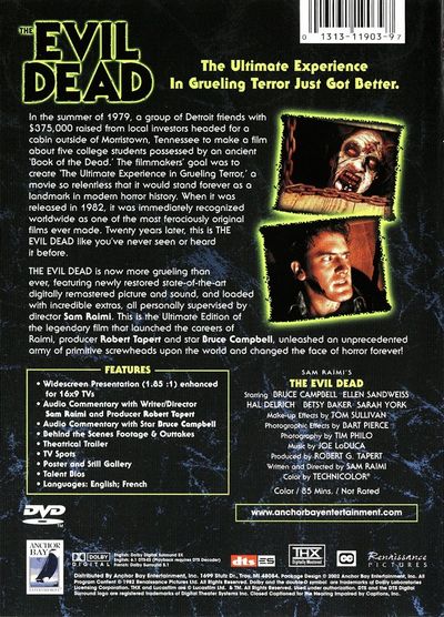 The Ultimate Experience In Grueling Terror Just Got Better.In the summer of 1979, a group of Detroit friends with $375,000 raised from local investors headed for a cabin outside of Morristown, Tennessee to make a film about five college students possessed by an ancient 'Book of the Dead.' The filmmakers' goal was to create 'The Ultimate Experience in Grueling Terror,' a movie so relentless that it would stand forever as a landmark in modern horror history. When it was released in 1982, it was immediately recognized worldwide as one of the most ferociously original films ever made. Twenty years later, this is The Evil Dead like you've never seen or heard it before.The Evil Dead is now more grueling than ever, featuring newly restored state-of-the-art digitally remastered picture and sound, and loaded with incredible extras, all personally supervised by director Sam Raimi. This is the Ultimate Edition of the legendary film that launched the careers of Raimi, producer Robert Tapert and star Bruce Campbell unleashed an unprecedented army of primitive screwheads upon the world and changed the face of horror forever!