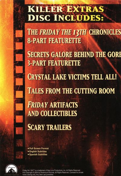 Killer Extras Disc Includes:- The Friday The 13th Chronicles 8-Part Featurette- Secret's Galore Behind The Gore 3-Part Featurette- Crystal Lake Victims Tell All!- Tales From The Cutting Room- Friday Artifacts And Collectibles- Scary Trailers |