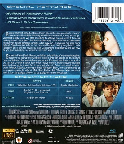 Brilliant scientist Sebastian Caine (Kevin Bacon) has one passion: to uncover the secrets of invisibility. Working with his research team in a top-secret government facility, Caine will stop at nothing to achieve his goal, even if it means making himself the project's first human guinea pig. But Caine and his team soon find out that making someone invisible is the easy part - it's keeping him sane that's difficult. Now Caine is a killer on the loose and his team, led by ex-girlfriend Linda (Elisabeth Shue) and her new beau Matt (Josh Brolin), must destroy him. But how do you stop something - or someone - you can't see? |