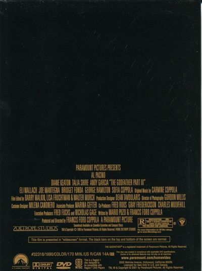 One of the greatest sagas in movie history continues. In this third film in the epic Corleone trilogy, Al Pacino reprises the role of powerful family leader Michael Corleone. Now in his 60's, Michael is dominated by two passions: freeing his family from crime and finding a suitable successor. That successor could be fiery Vincent (Andy Garcia)...but he may also be the spark that turns Michael's hope of business legitimacy into an inferno of mob violence.Francis Ford Coppola directs , Garcia, Diane Keaton, Talia Shire, Eli Wallach, Sofia Coppola, Joe Mantegna and others in this exciting, long-awaited film that masterfully explores the themes of power, tradition, revenge and love. Seven Academy Award® nominations for 1990 were the result, including Best Picture. |