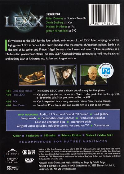 It's welcome to the USA fior the four galactic anti-heroes of the LEXX. After jumping out of the frying pan of Fire in Series3, the crew blunders into the inferno of AMerican politics. Earth is at the end of its tether and Prince (Nigel Bennett) the former evil ruler of Fire, resurfaces as a Machiavellian government official. This sexy SCI Fi Channel favorite continues to hold nothing sacred and nothing back as it charges into its last and longest season. 4.01 Little Blue Planet-The hungry LEXX takes a chunk out of a very familiar planet.4.02 Texx LEXX-Xev pours on the hot sauce at Texas trailer park; Kai hooks up with a doomsday cult; Stan gets arrested by the ATF.4.03 P4X-Xev is exploited in a steamy woman's prison; Stan tries to escape.4.04 Stan Down-President Priest frees Stan and enlists him in a plot to kill Prince.