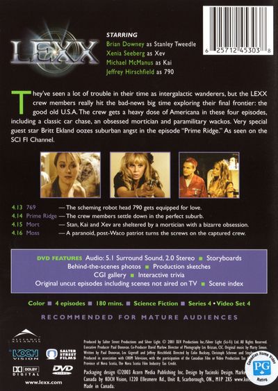 They’ve seen a lot of trouble in their time as intergalactic wanderers, but the LEXX crew members really hit the bad-news big time exploring their final frontier: the good old U.S.A. The crew gets a heavy dose of Americana in these four episodes, including a classic car chase, an obsessed mortician and paramilitary wackos. Very special guest star Britt Ekland oozes suburban angst in the episode "Prime Ridge." As seen on the SCI FI Channel.4.13 769 — The scheming robot head 790 gets equipped for love.4.14 Prime Ridge — The crew members settle down in the perfect suburb.4.15 Mort — Stan, Kai and Xev are sheltered by a mortician with a bizarre obsession.4.16 Moss — A paranoid, post-Waco patriot turns the screws on the captured crew.