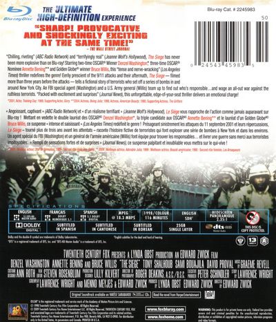 "Chilling, riveting" (ABC Radio Network) and "terrifyingly real" (Jeann Wolf's Hollywood), THE SIEGE has never been more explosive than on Blu Ray! Starring two time Oscar Winner Denzel Washington, three time Oscar Nominee Annette Bening and Golden Globe winner Bruce Willis, this "tense and nerve wracking" (Los Angeles Times) thriller redefines the genre!Eerily prescient of the 9/11 attacks and their aftermath, THE SIEGE- filmed more than three years before the attacks, tells a fictional story of terrorists who set off a series of bombs in and around New York City. An FBI special agent (Washington) and a U.S Army general (Willis) team up to find out who's responsible...and wage am all out war against the ruthless terrorists. "Packed with excitement and surprises" (Journal News), this unforgettable, edge of your seat thriller delivers an emotional charge! |