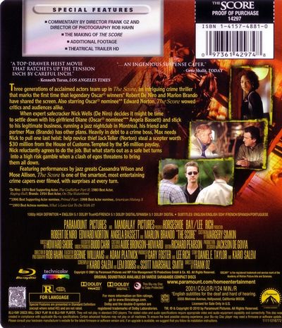 "A TOP-DRAWER HEIST MOVIE THAT RATCHETS UP THE TENSION INCH BY CAREFUL INCH." – Kenneth Turan, Los Angeles Times"…AN INGENIOUS SUSPENSE CAPER." – Gene Shalit, TodayThree generation of acclaimed actors team up in The Score, an intriguing crime thriller that marks the first time that legendary Oscar winners Robert De Niro and Marlon Brando have share the screen. Also starring Oscar nominee Edward Norton, The Score wowed critics and audiences alike.When expert safecracker Nick Wells (De Niro) decides it might be time to settle down with his girlfriend Diane (Scar nominee Angela Bassett) and stick to his legitimate business, running a jazz nightclub in Montreal, his friend and partner Max (Brando) has other plans. Heavily in debt to a crime boss, Max needs Nick to pull one last heist: help novice thief Jack Teller (Norton) steal a scepter worth $30 million from the House of Customs. Tempted by the $6 million payday, Nick reluctantly agrees to do the job. But what starts out as a safe bet turns into a high risk gamble when a clash of egos threatens to bring them all down.Featuring performances by jazz great Cassandra Wilson and Mose Allison, The Score is one of the smartest most entertaining crime capers ever filmed, with surprises at every turn.