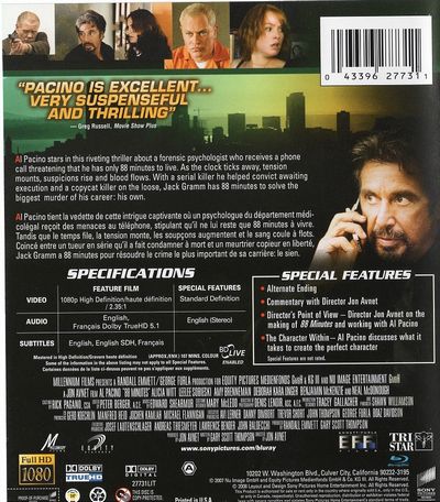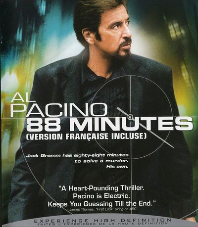 Al Pacino stars in this riveting thriller about a forensic psychiatrist who receives a phone call threatening that he has only 88 minutes to live. As the clock ticks away, tension mounts, suspicions rise and blood flows. With a serial killer he helped convict awaiting execution and a copycat killer on the loose, Jack Gramm has 88 Minutes to solve the biggest murder of his career: his own.---Al Pacino tient la vedette de cette intrigue captivante où un psychologue du département médicolégal reçoit des menaces au téléphone, tipulant qu'il ne lui reste que 88 minutes à vivre. Tandis que le temps file, la tension monte, les soupçons augmentent et le sang coule à flots. Coincé entre un tueur en série qu'il a fait condamner à mort et un meurtrier copieur en liberté, Jack Gramm a 88 minutes pour résoudre le crime le plus important de sa carrière: le sien. |