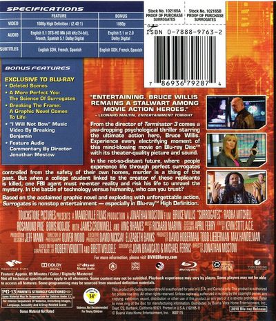 From the director of Terminator 3 comes a jaw-dropping psychological thriller staring the ultimate action hero, Bruce Willis. Experience every electrifying moment of this mind-blowing movie on Blu-ray Disc with it's theater-quality and sound.In the not-so-distant future, where people experience life through perfect surrogates controlled from the safety of their own homes, murder is a thing of the past. But when a college student linked to to the creator of these replicantes is killed, one FBI agent must re-enter reality and risk his life to unravel the mystery. In the battle of technology versus humanity, who can you trust? Based on the acclaimed graphic novel and exploding with unforgettable action, Surrogates in nonstop entertainment - especially in Blu-ray High Definition |