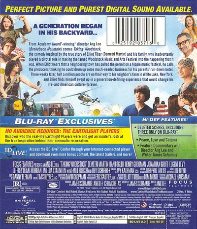 From Academy Award®-winning* director Ang Lee (Brokeback Mountain) comes Taking Woodstock, the comedy inspired by the true story of Elliot Tiber (Demetri Martin) and his family, who inadvertently played a pivotal role in making the famed Woodstock Music and Arts Festival into the happening that it was. When Elliot hears that a neighboring town has pulled the permit on a hippie music festival, he calls the producers thinking he could drum up some much-needed business for his parents' run-down motel. Three weeks later, half a million people are on their way to his neighbor's farm in White Lake, New York, and Elliot finds himself swept up in a generation-defining experience that would change his life—and American culture—forever. |