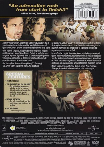 Academy Award winner Al Pacino and Matthew McConaughey star in this adrenaline-charged thriller about the sexy, high-stakes world of sports betting, where fortunes can be made and lost with a flip of a coin.When Brandon Lang (McConaughey) becomes the protégé of sports gambling’s power player, Walter Abrams (Pacino), he swiftly becomes the golden boy of the high-rolling world for consistently picking football winners. Now, with millions on the line, he finds himself in a deadly game of con-versus-con with his new mentor.Also starring Rene Russo and Jeremy Piven (TV’s Entourage), Two For The Money sizzles with intense, non-stop thrills!Le lauréat d’un Academy Award Al Pacino partage la vedette avec Matthew McConaughey dans ce suspense chargé d’adrénaline sur l’univers grisant et hautement imprévisible des paris sportifs, où des fortunes peuvent être gagnées ou perdues en un clin d’œil.Lorsque Brandon Lang (McConaughey) devient le protégé du ponte des paris sportifs Walter Abrams (Pacino), il accède au statut de prodige aux yeux des flambeurs en choisissant constamment les vainqueurs des matches de football. Les mises atteignent alors des millions de dollars et il se retrouve coincé, avec son nouveau mentor, dans un affrontement mortel entre escrocs.Mettant également en vedette Rene Russo et Jeremy Piven (l’emission Entourage), Pris au Jeu bouillonne d’émotions fortes ininterrompues!