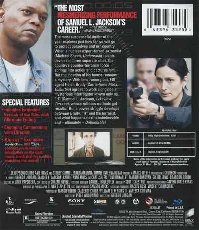 The most suspenseful thriller of the year explores how far we will go to protect ourselves and our country. When a nuclear expert-turned-extremist (Michael Sheen, Underworld) plants devices in three separate cities, the country's counter-terrorism force springs into action and captures him. But the location of his bombs remains a mystery. With time running out, FBI agent Helen Brody (Carrie-Anne Moss, Disturbia) agrees to work alongside a mysterious interrogator known only as "H" (Samuel L. Jackson, Lakeview Terrace), whose ruthless methods get results. But a power struggle develops between "H" and the terrorist, and what happens next is unbelievable and - ultimately - Unthinkable! |