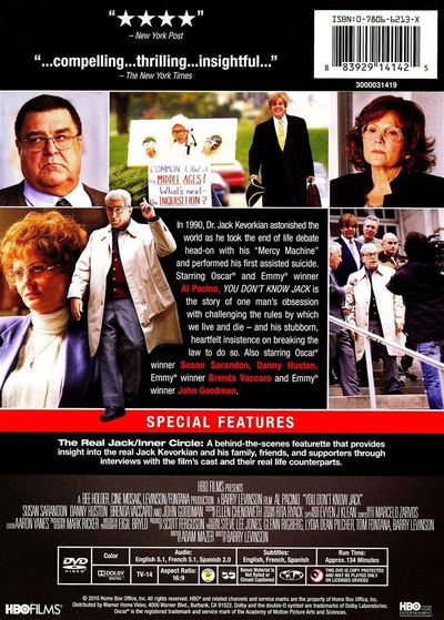 In 1990, Dr. Jack Kevorkian astonished the world as he took the end of life debate head-on with his "Mercy Machine" and performed his first assisted suicide. Starring Oscar and Emmy winner Al Pacino, YOU DON'T KNOW JACK is the story of one man's obsession with challenging the rules by which we live and die - and his stubborn. heartfelt insistence on breaking the law to do so. Also starring Oscar winner Susan Sarandon, Danny Houston, Emmy winner Brenda Vaccaro, and Emmy winner John Goodman. |
