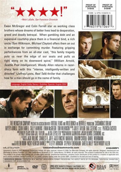 Ewan McGregor and Colin Farrell star as working class brothers whose dreams of better lives leads to desperation, greed and deadly betrayal. When gambling debt and an expensive courtship place them in a financial bind, a rich uncle (Tom Wilkinson, Michael Clayton) offers them an out in exchange for committing murder. Featuring gripping performances from an all-star cast; "this family tragedy puts us near the edge of our seats and pulls us right along on its downward spiral" (William Arnold, Seattle Post Intelligencer). Woody Allen returns in razor-sharp form with this "intense, intelligently-written and directed," (Jeffrey Lyons, Reel Talk) thriller that challenges how far a man should go in the name of family. |